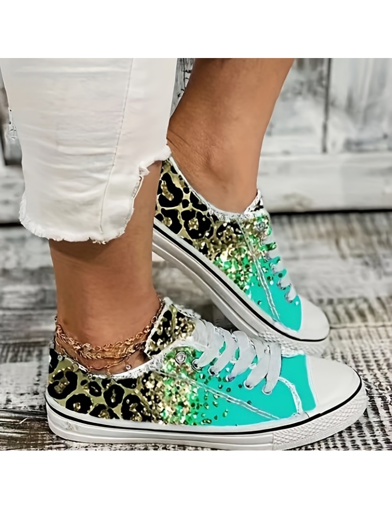 Women's Leopard Print Canvas Shoes, Casual Glitter Sequins Decor Lace Up Shoes, Lightweight Low Top Sneakers