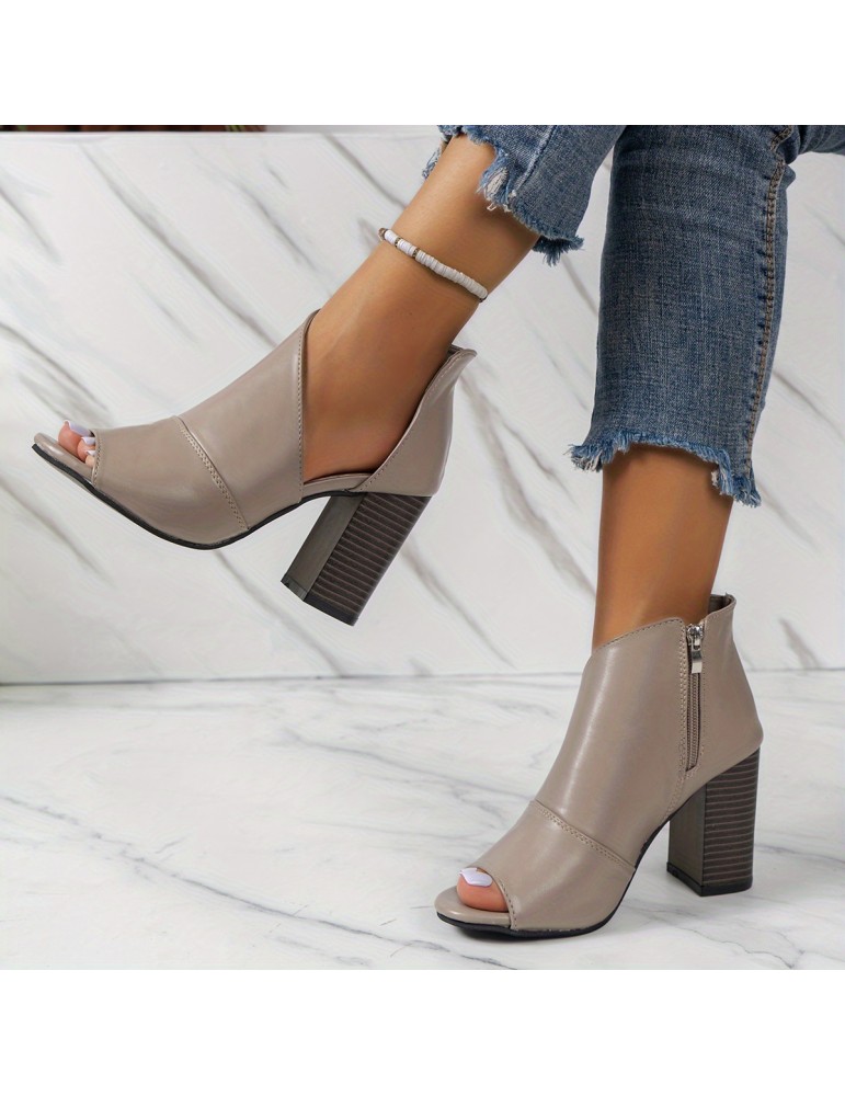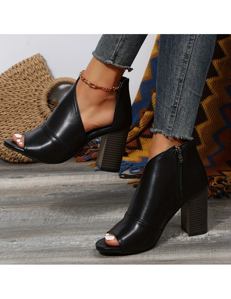 Patterned: Solid colorMaterial: Faux leatherHeel Type: Block heelClosure: ZipperToe Style: Open ToeS..