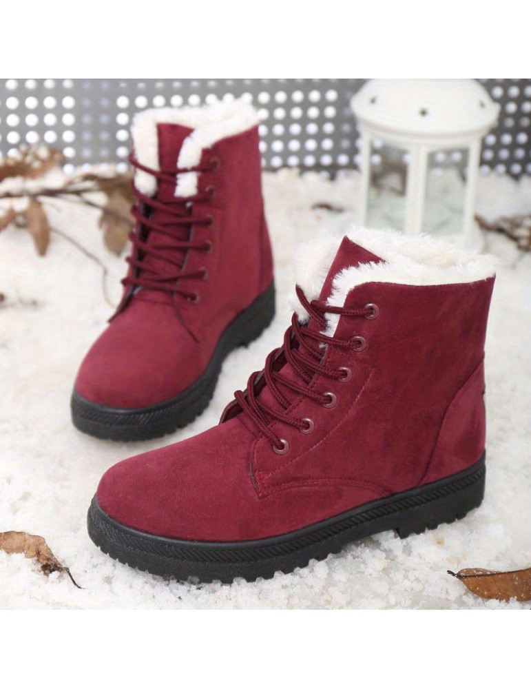 • Women's Solid Color Platform Boots, Lace Up Velvet Warm Fluffy Non-slip Round Toe Outdoor Shoes, Winter Snow Boots