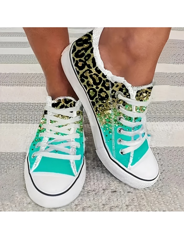 Women's Leopard Print Canvas Shoes, Casual Glitter Sequins Decor Lace Up Shoes, Lightweight Low Top Sneakers