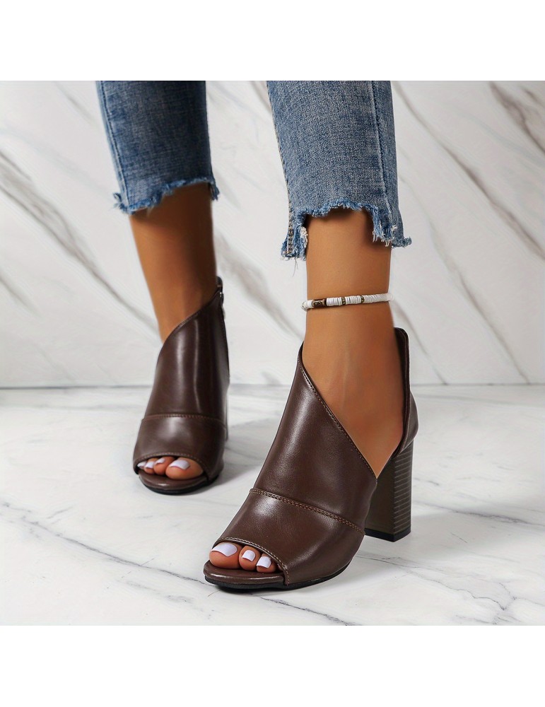 Patterned: Solid colorMaterial: Faux leatherHeel Type: Block heelClosure: ZipperToe Style: Open ToeS..